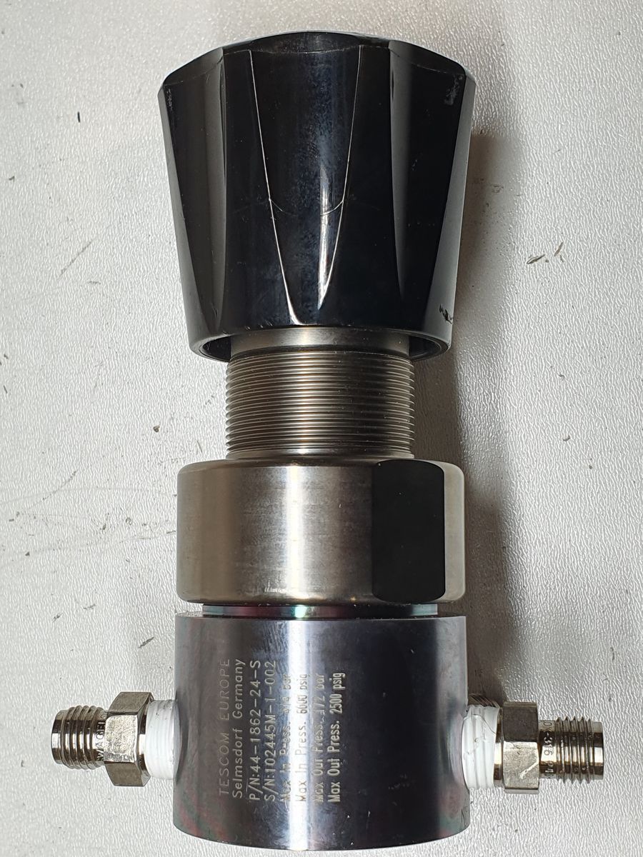 The Tescom 44-1862-24S (part of the 44-1800 Series piston-sensed pressure reducing regulators) is a high-pressure gas regulator designed for controlled reduction of supply pressure in industrial, test, and process systems. Rated for very high inlet pressures up to 6000 psi (414 bar) and providing a regulated outlet up to 2500 psi (172 bar), it delivers stable, repeatable downstream pressure for general-purpose, high-pressure gas applications.